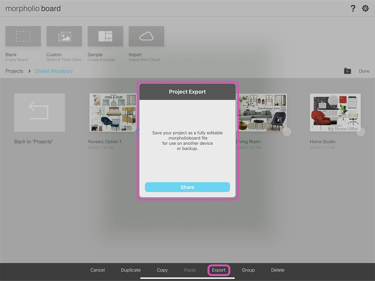 Tap "Export" to save your project as a fully editable .morpholioboard file.