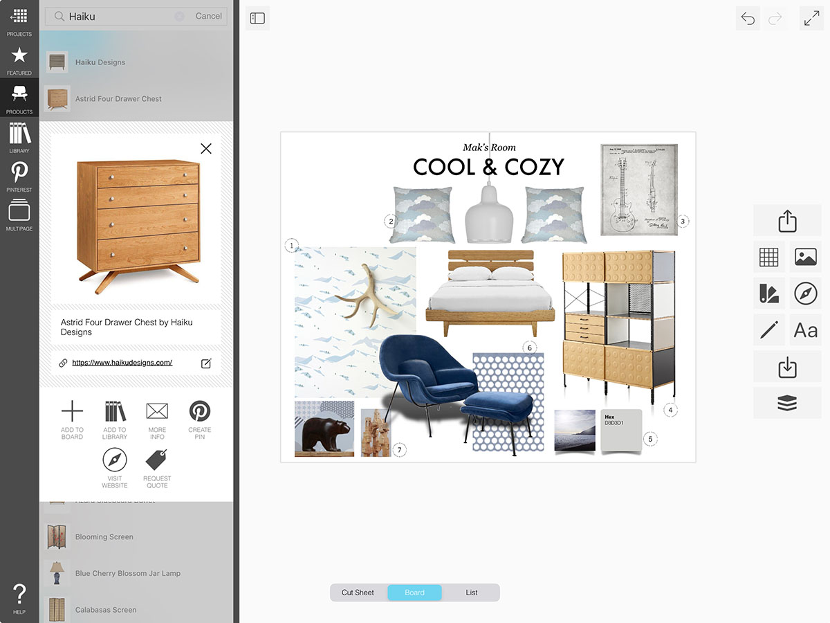 A key benefit of storing your products in your personal library is that all of the notes that you've added in the Cut Sheets and Lists view for your product will be attached to the product when you add it to another board!