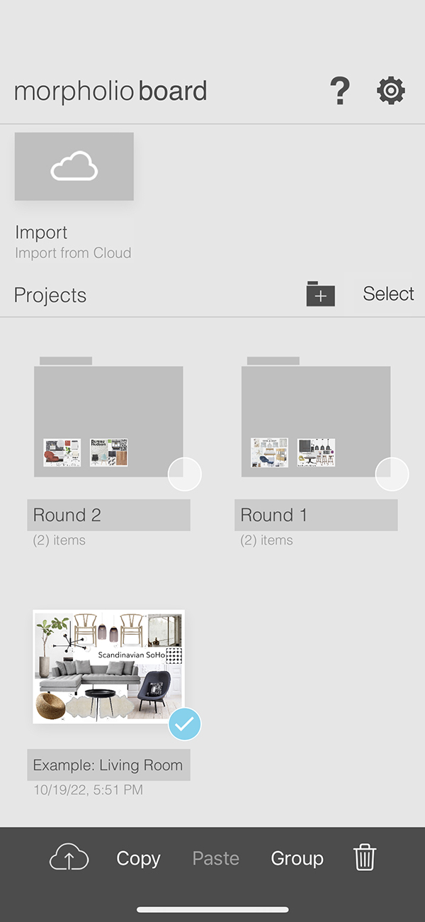 To copy a project from one location to another, tap "Select", select the project, and then tap "Copy" on the bottom. Next, navigate to another location where you want to add the project. Last, tap "Paste" to add a copy of the project to the new location.