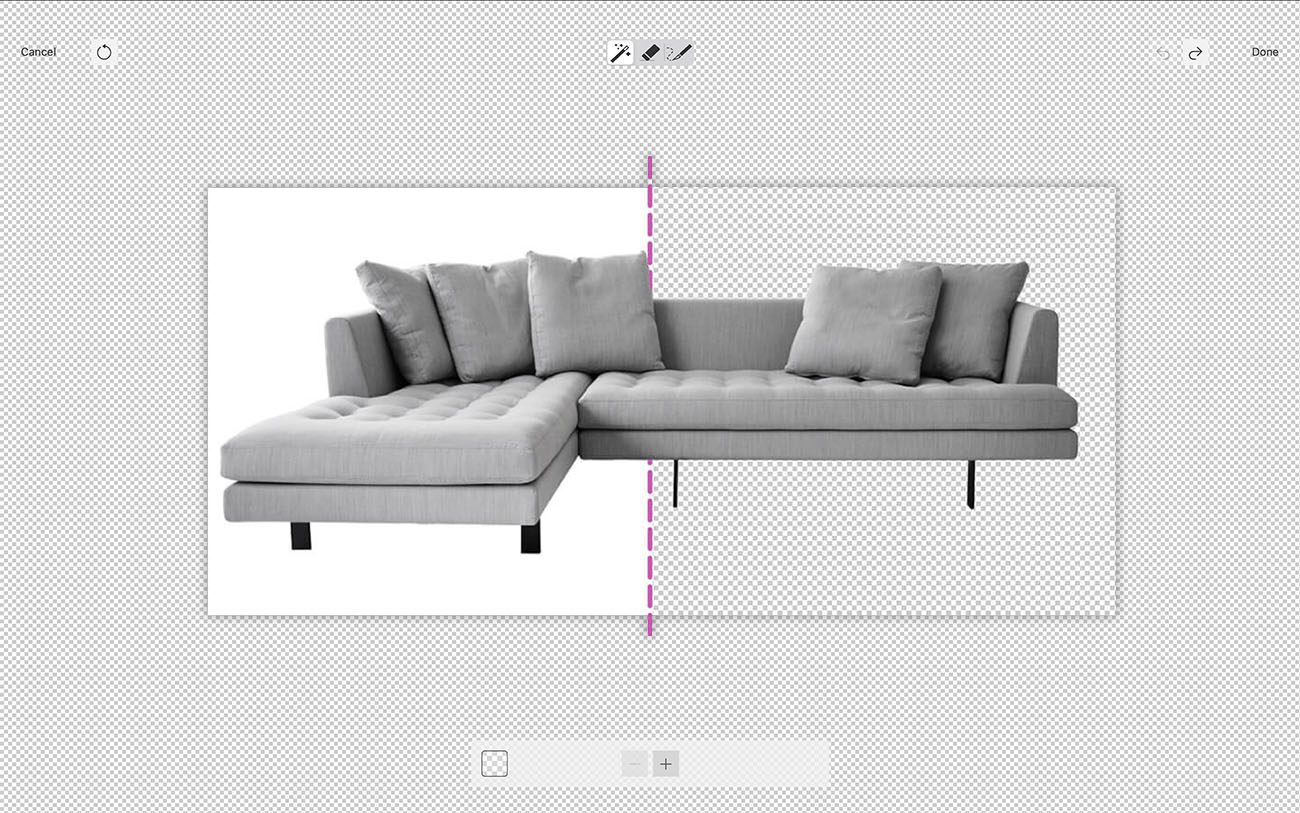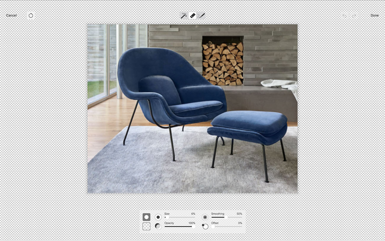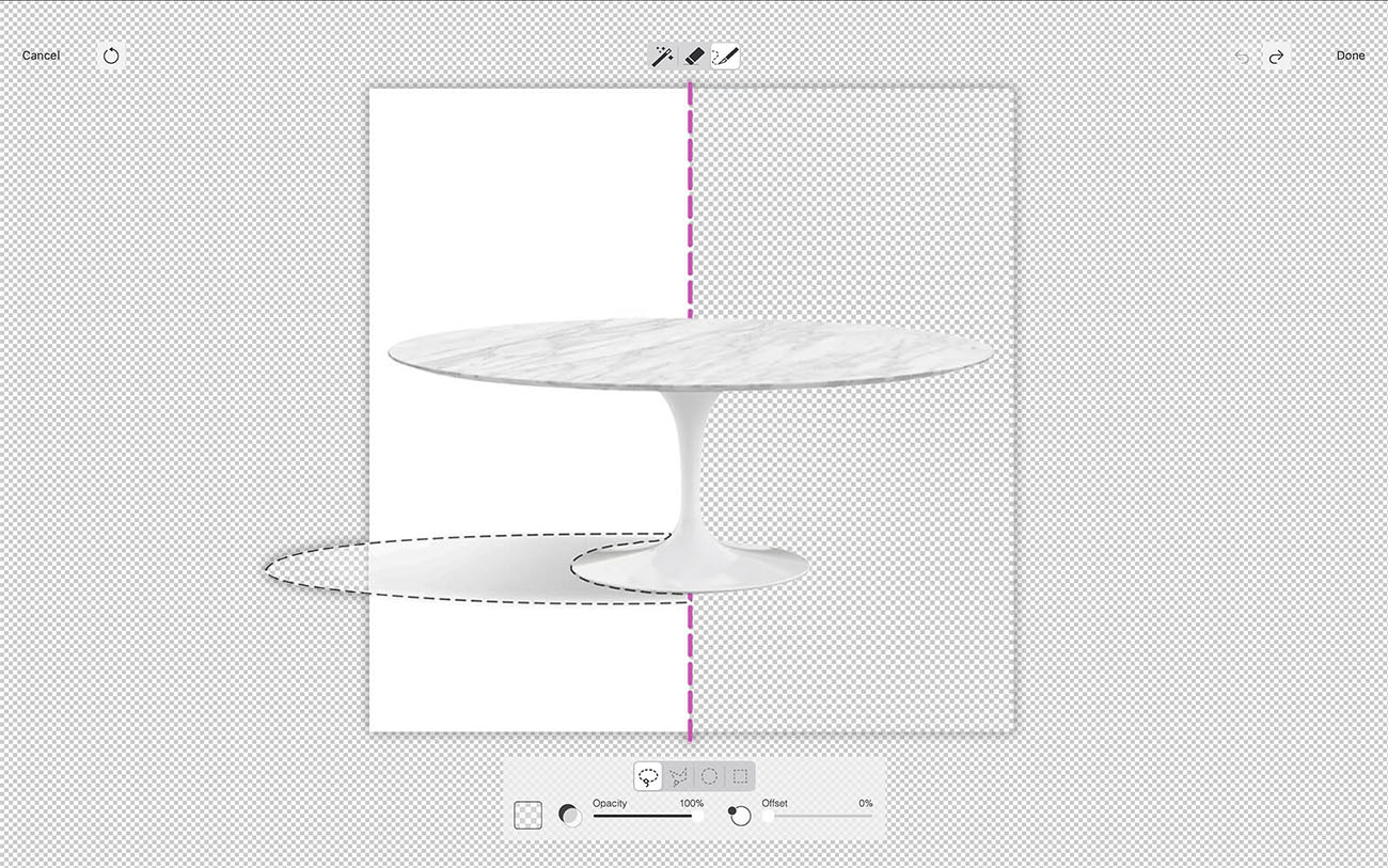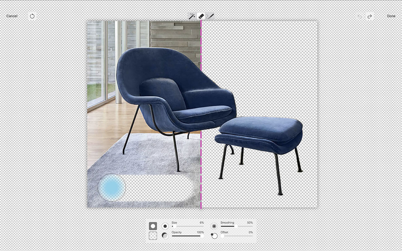 Simply click and drag with one finger to cut out an image. The knife works great for clipping unwanted shadows or use it to quickly pull an item out of a scene. Adjust your Opacity to set your knife.