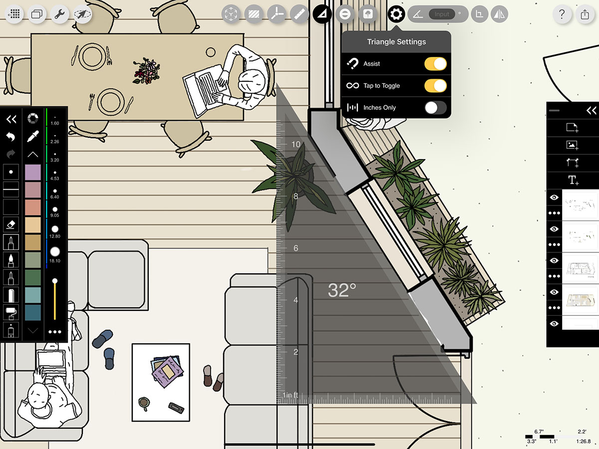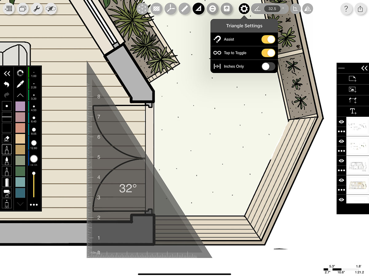 Tap the Super Triangle button to turn on the Super Triangle. You can use this tool to draw straight lines along the edge. You can also measure distances with the triangle edge. When you zoom in and out, you'll see that the units adjust to give you the best measurements at any view.
