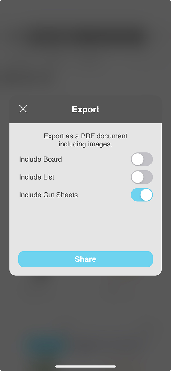 Tap the Export button on the board toolbar and then tap "Share" to share your cut sheet PDF.