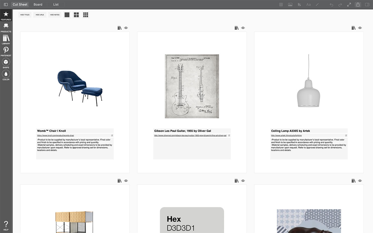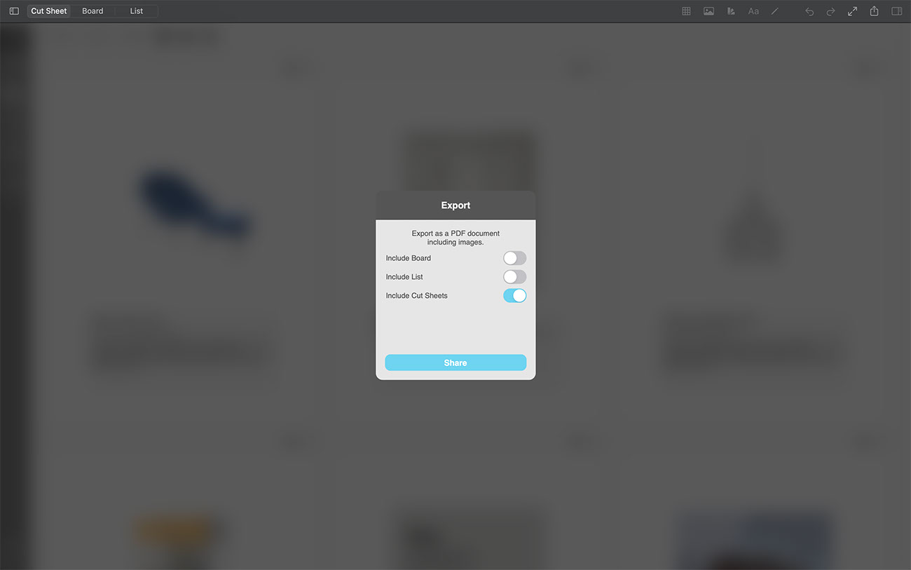 Remember that while you're busy creating a beautiful moodboard or creative collage, Morpholio Board is working behind the scenes to make cut sheets for each product on your board. When you're ready, you can share your cut sheets as a PDF with any collaborator or client.