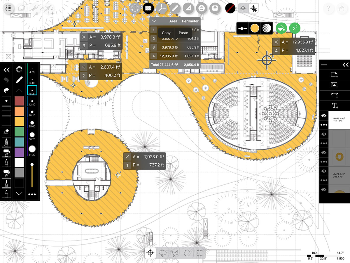 In addition to adding beautiful fills and hatches to your drawing, Smart Fill also gives you live area and perimeter calculations while you draw.
