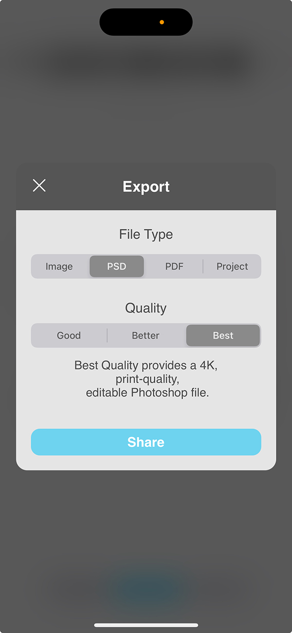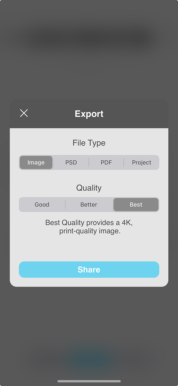 If you select "Image" or "PSD" as your file type, you can choose the quality of your export. Then, tap "Share".