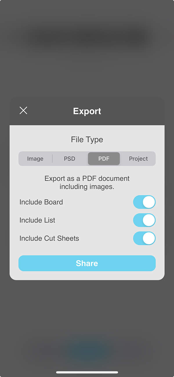 Share the image, PSD, PDF, or project file for your board through AirDrop, email, messages, or share directly to your social media channels.