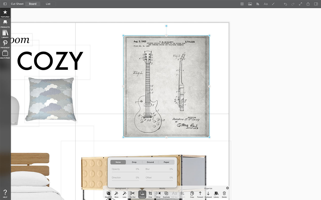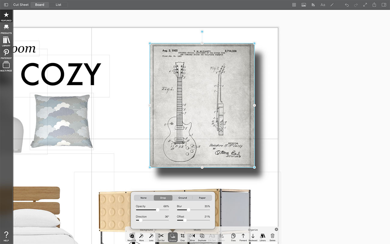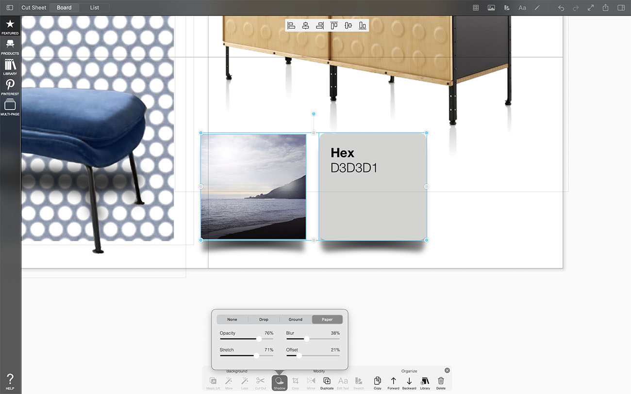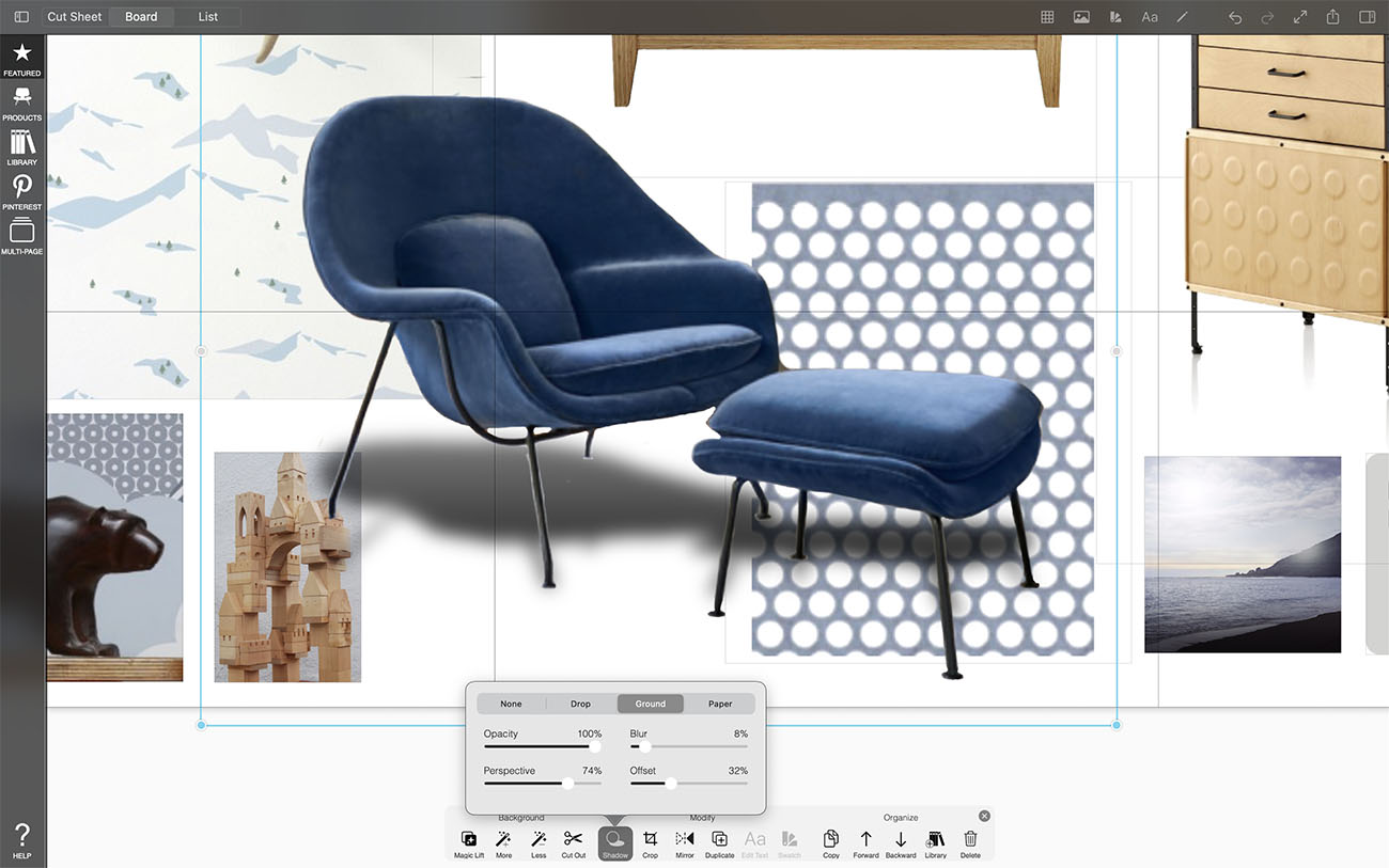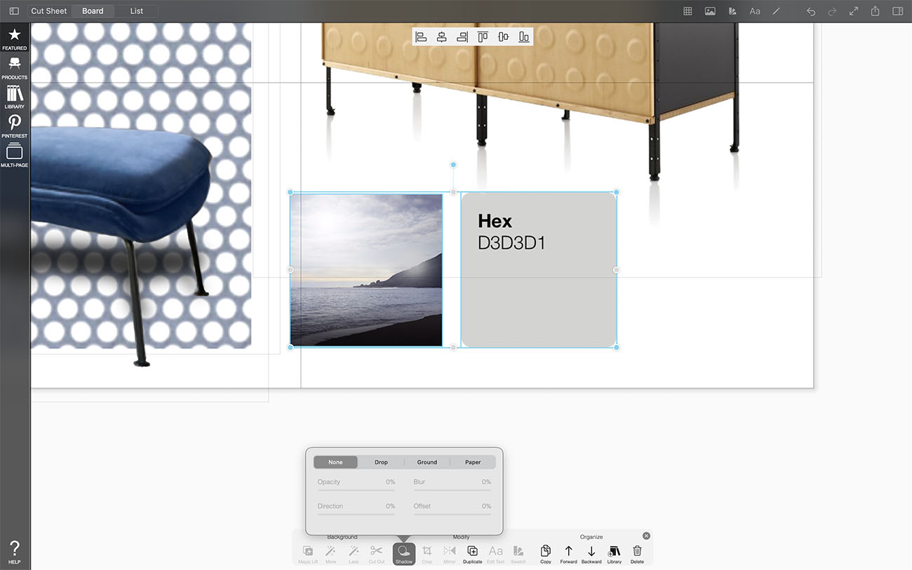 Would you like to add depth and a little polish to your mood and design boards? In Morpholio Board, the best app for interior design, you can add shadows to your images to help your designs pop off the page!