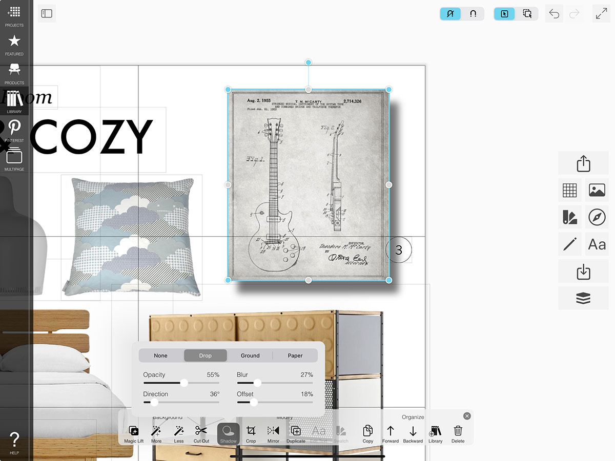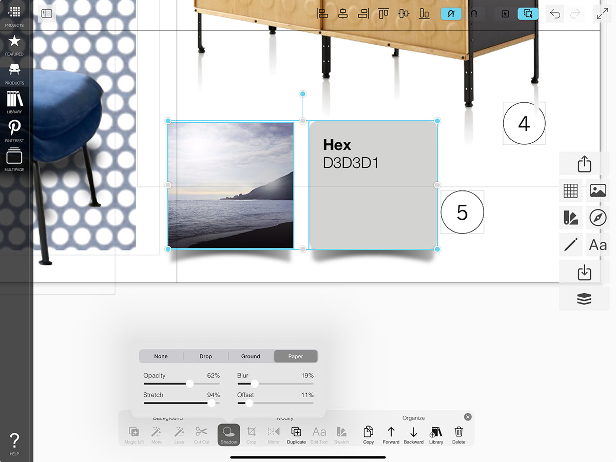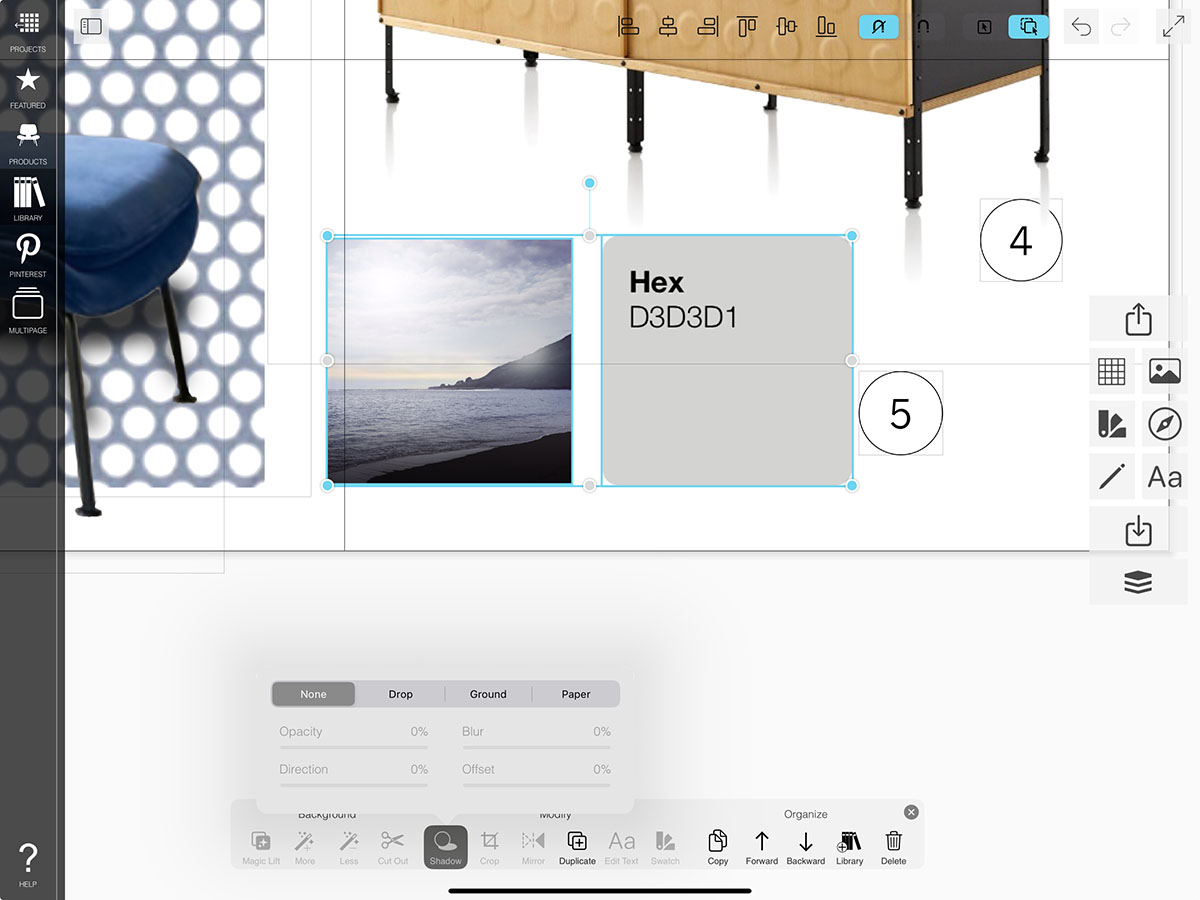 Would you like to add depth and a little polish to your mood and design boards? In Morpholio Board, the best app for interior design, you can add shadows to your images to help your designs pop off the page!