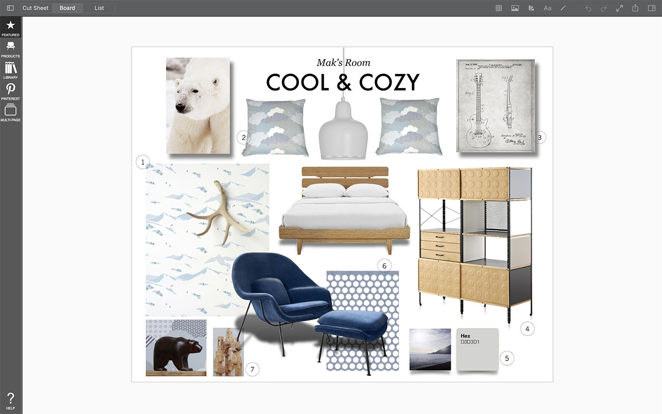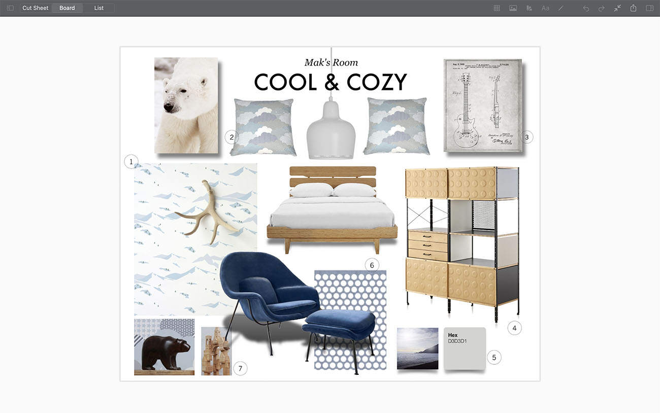 In addition to being a professional interior design product app, Board is perfect for presenting your work to teammates or clients. Meet "Presentation Mode" where you can hide all of your libraries and toolbars to show your work in full screen.
