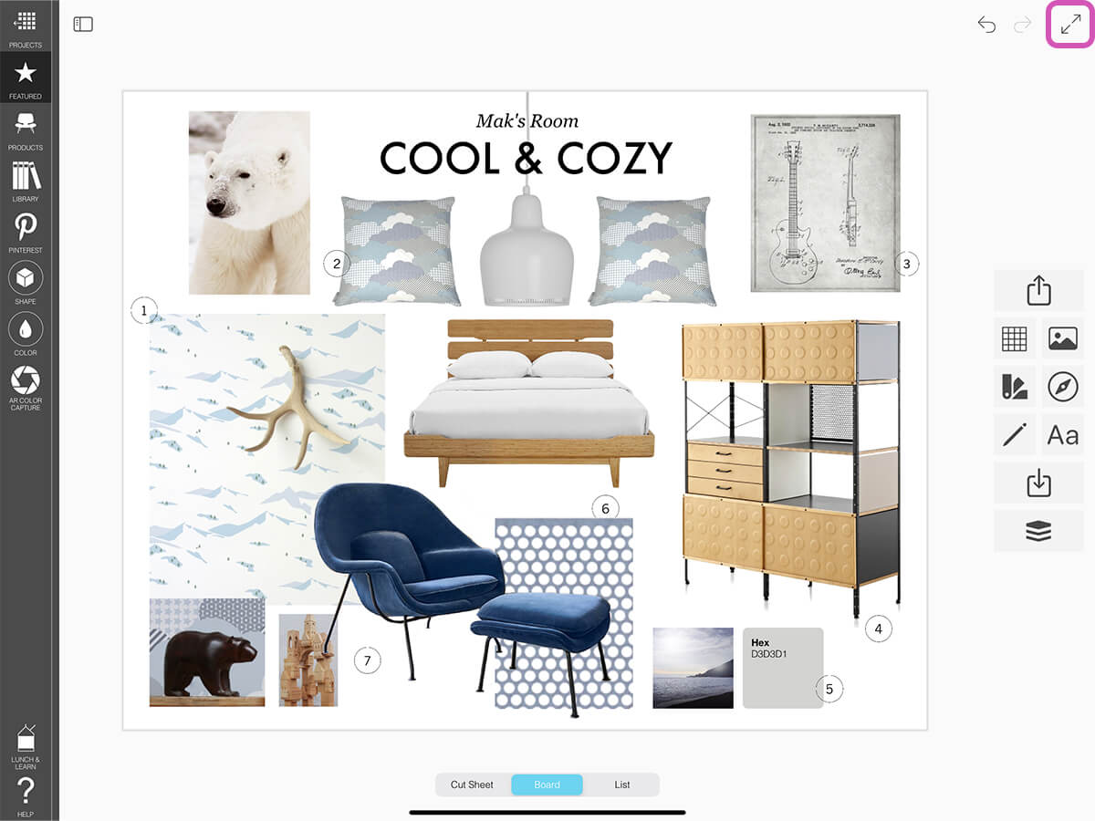 In addition to being a professional interior design product app, Board is perfect for presenting your work to teammates or clients. Meet "Presentation Mode" where you can hide all of your libraries and toolbars to show your work in full screen.