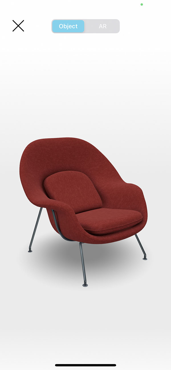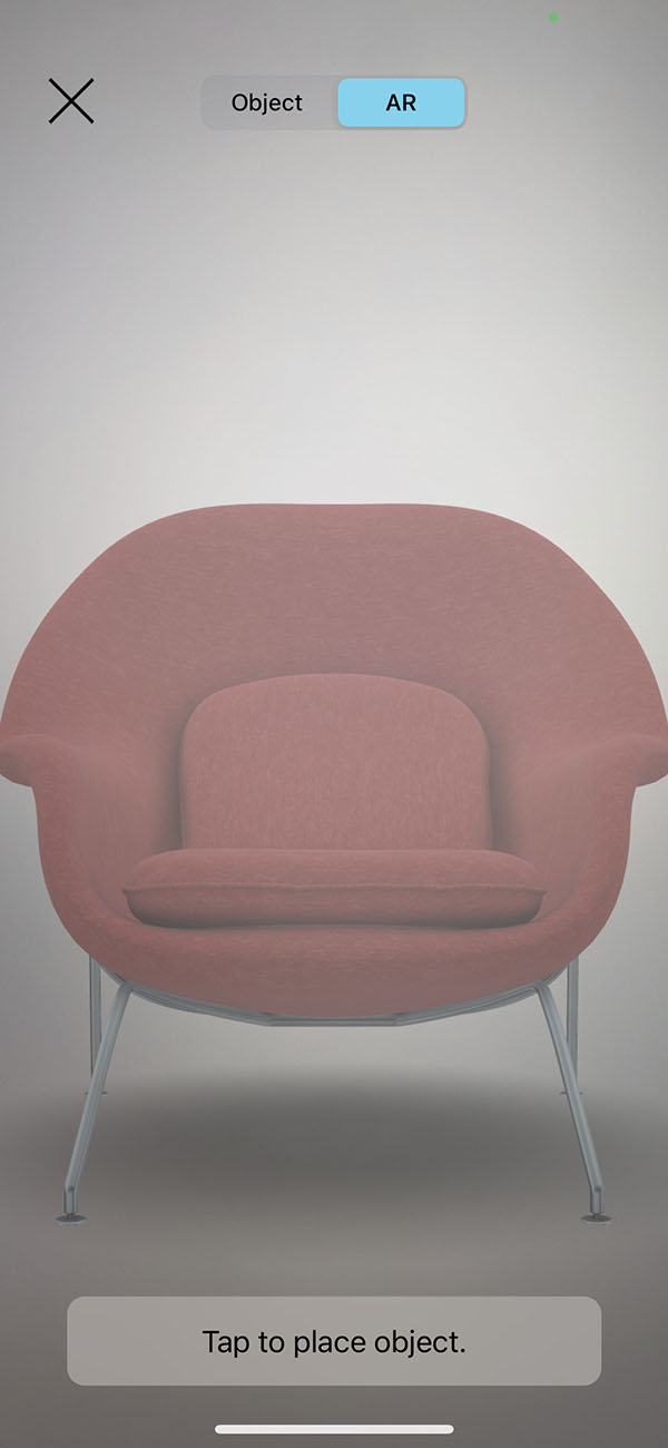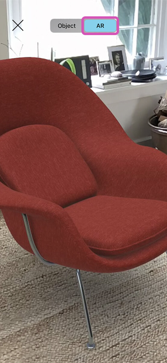 Press & drag one finger to move the object along the ground plane. Press & twist two fingers to rotate the object until it is in the desired position. Now you can walk around and see the product in your space! When you're done, tap the "X" in the top left corner to return to your board.