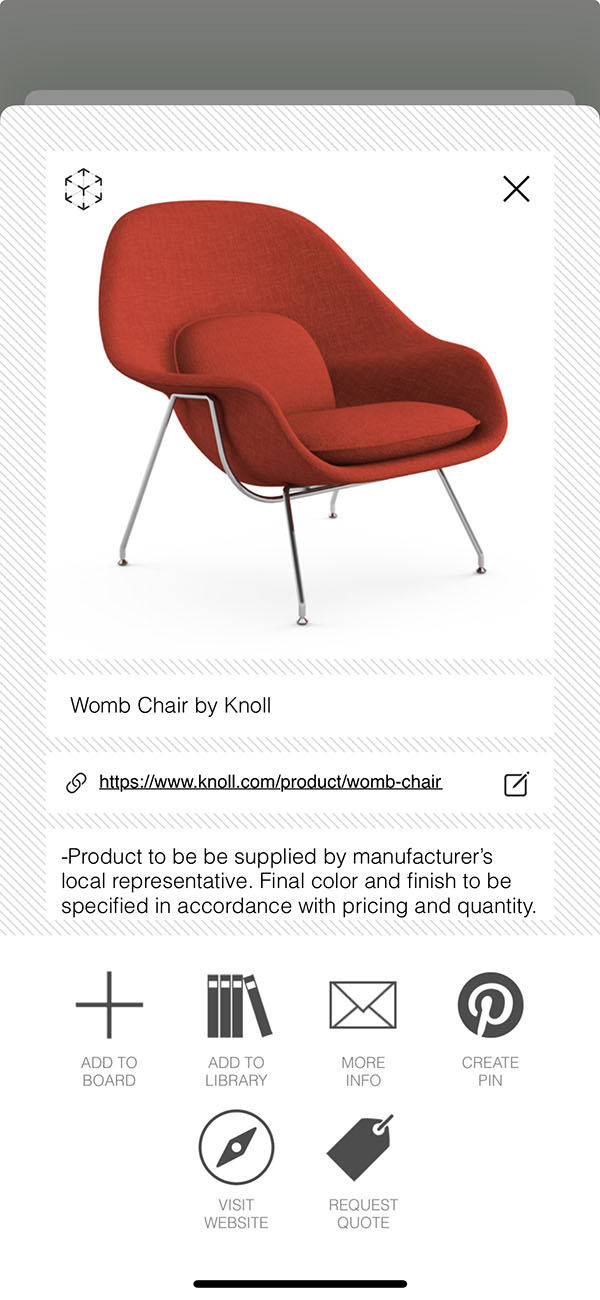 Viewing furniture in your space using AR is essential before buying it and now this is the industry standard. In Board, you can view gorgeous designs in your home to get a sense of it while you are collaging your interior design moodboard. Be careful though, the AR Furniture in Board is so real that you might just trip over it!