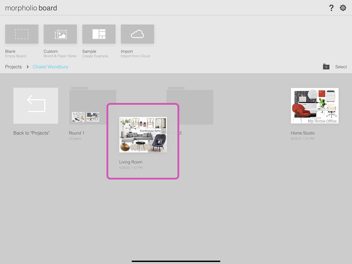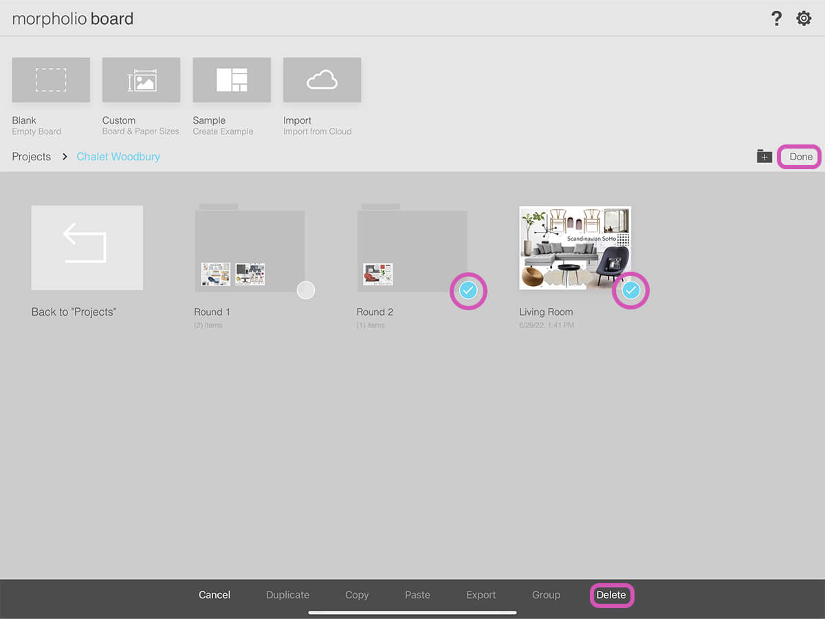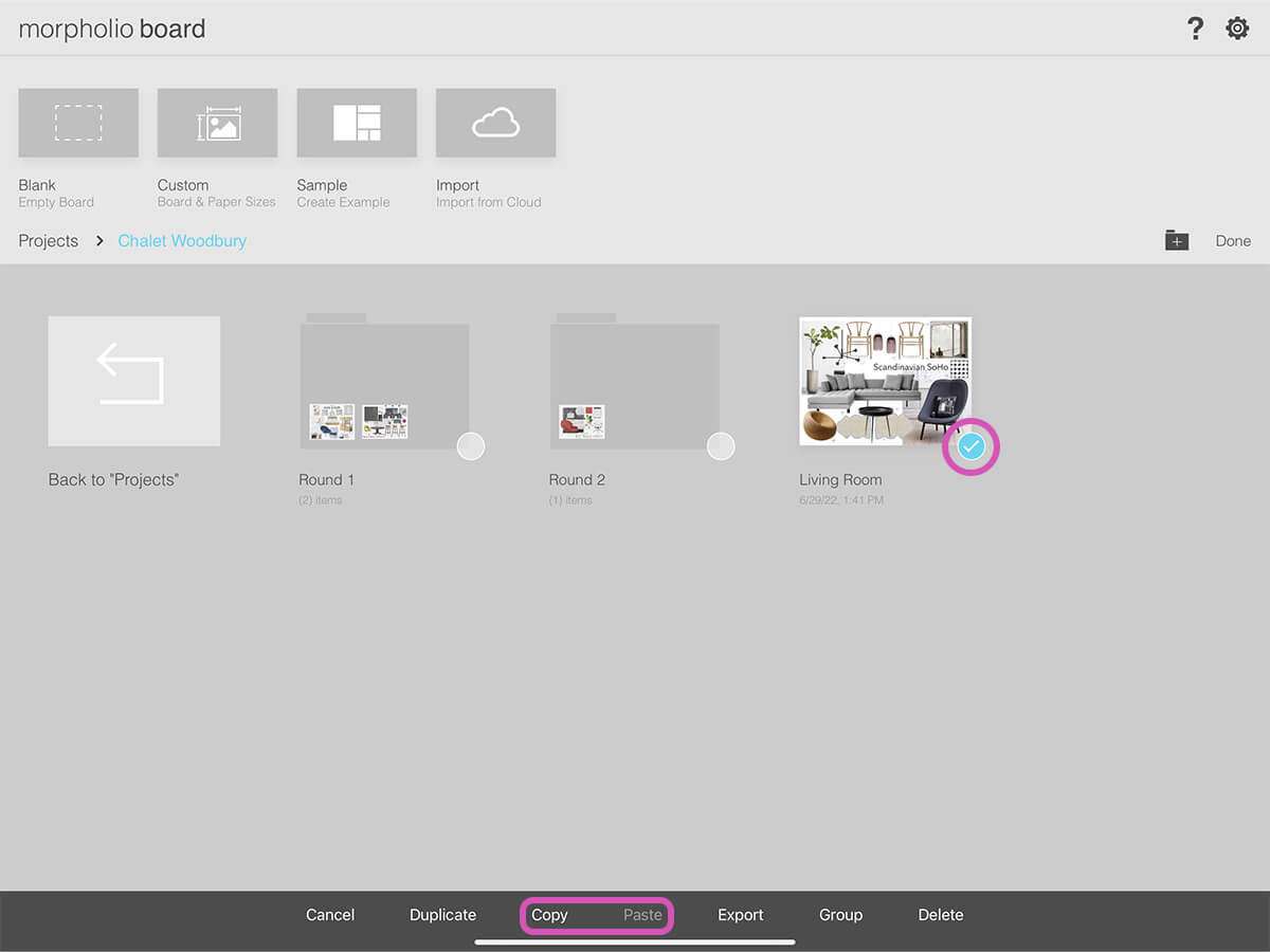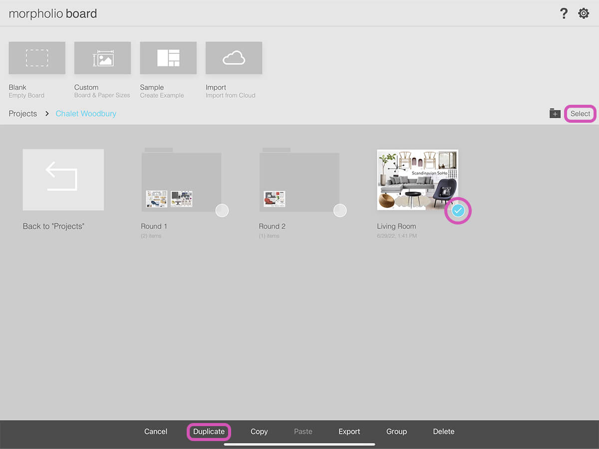 To make an exact copy of a project, tap "Select" and then select the project you want to duplicate. Next, tap "Duplicate" at the bottom.