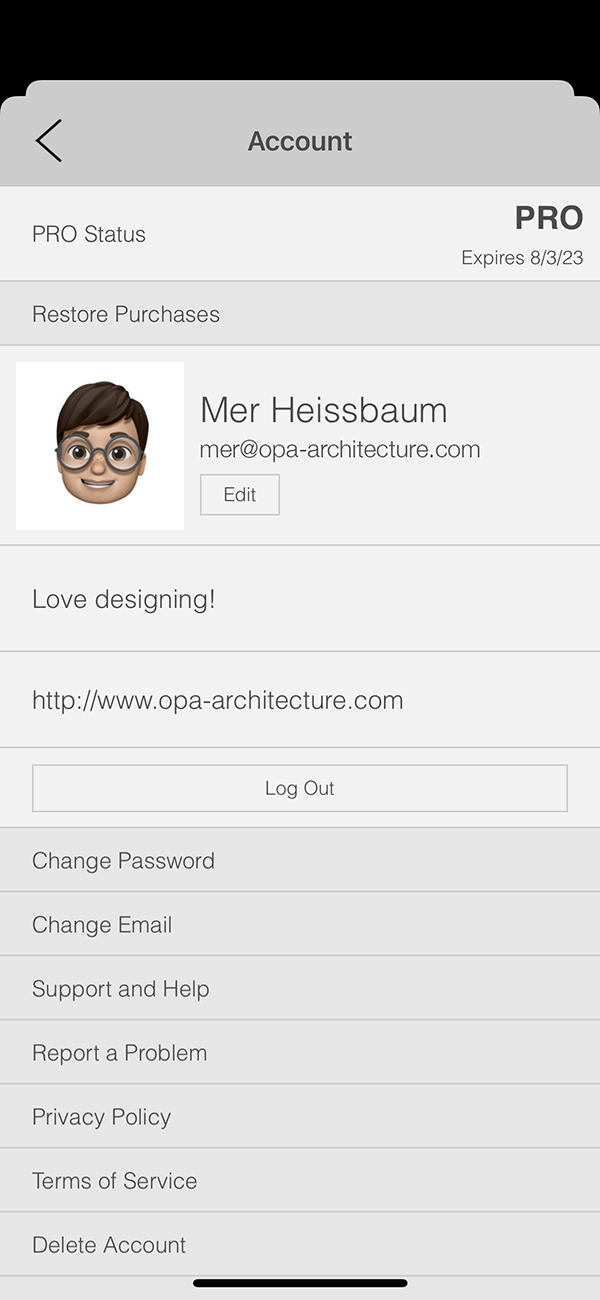 Use this section to edit your Morpholio account picture, personal description, and website. If you need to switch Morpholio accounts, just tap "Log Out". You can also change your Morpholio account password or email here too.