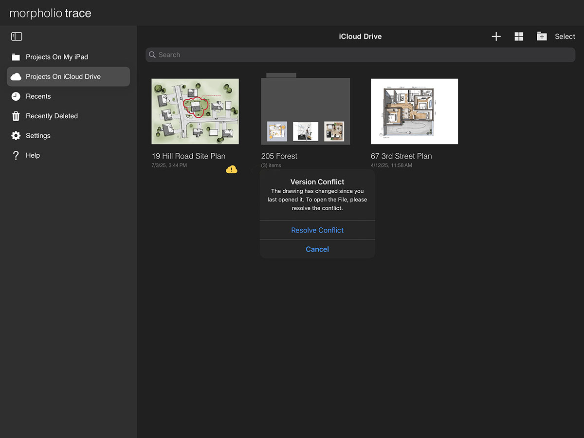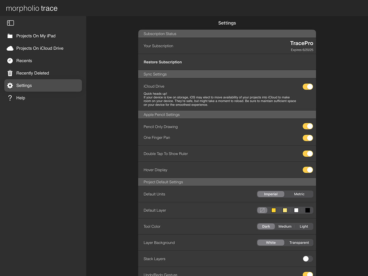 iCloud Drive makes it easy to protect your work and access your projects across all your personal devices. By enabling iCloud Drive, you can back up and sync your projects seamlessly. Simply turn on iCloud Drive in your Trace settings, then move your files into the "Projects on iCloud Drive" folder within the app. Any project in this folder will be available on all iOS devices signed in with the same Apple ID and with iCloud enabled.