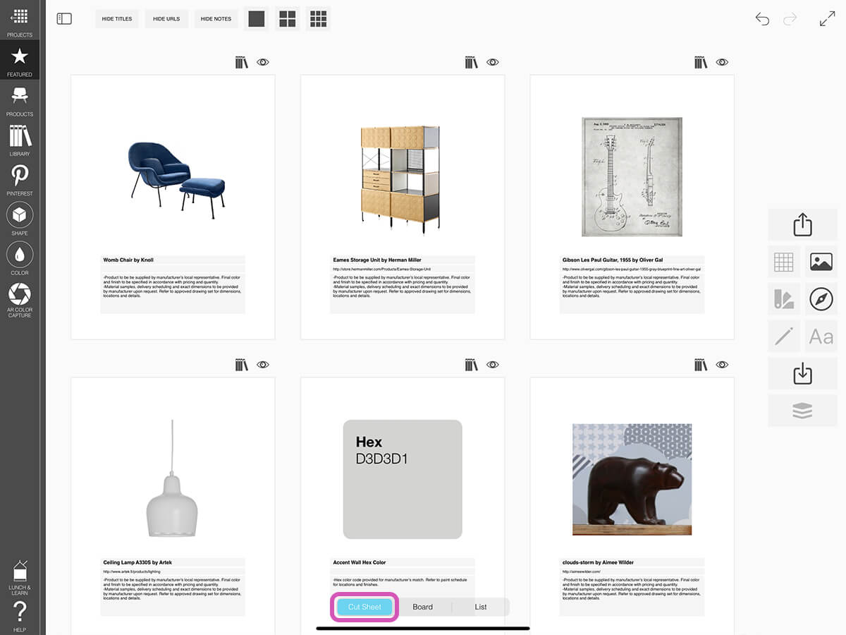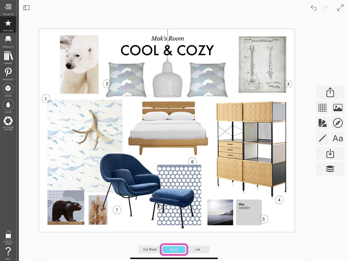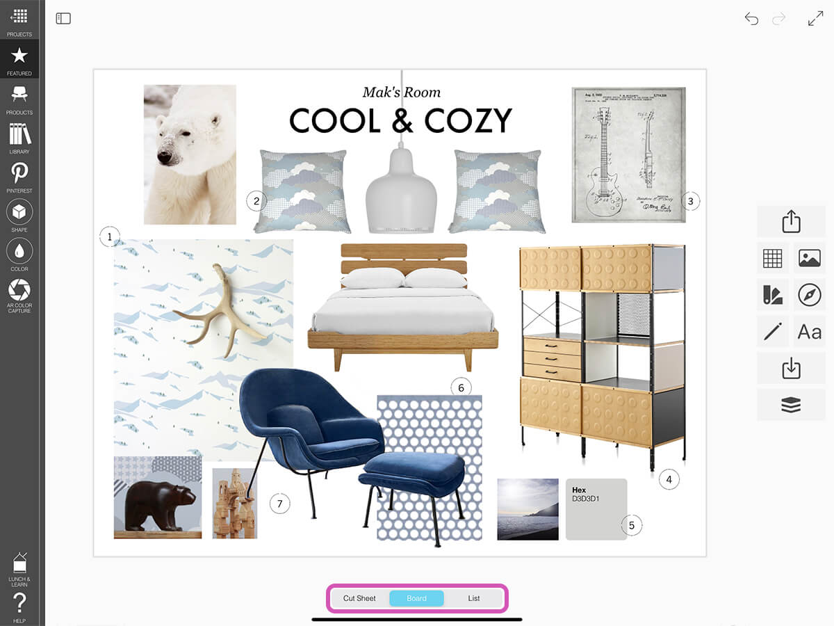 Ava (Automated Visual Assembly) is one of the most powerful moodboarding tools in the world, making Morpholio Board the best app for interior design. While you are creating your moodboard, Ava is working behind the scenes to create perfect cut sheets and a full product list for every item on your board. Ava is the patent-pending future of design documents.