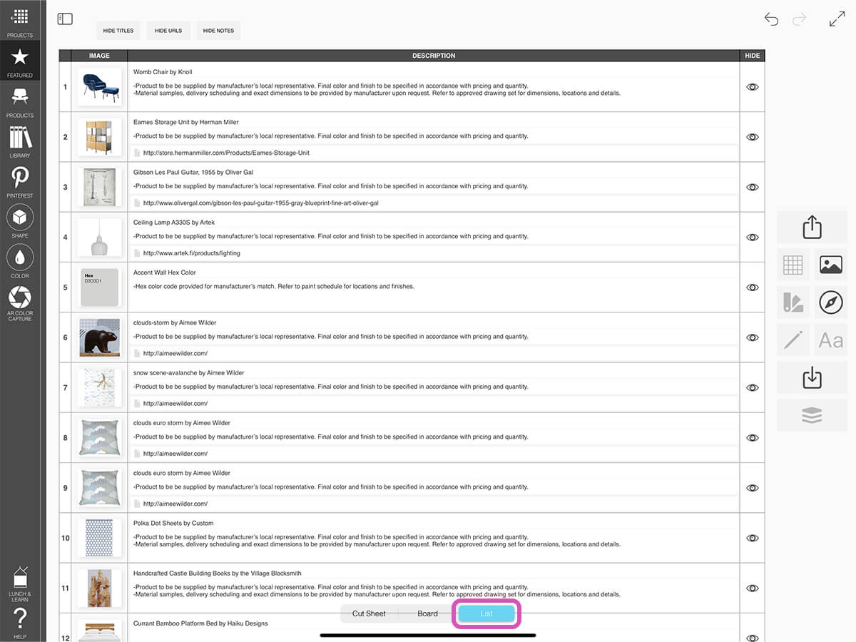 Use this mode to view and share a list of all products, including web addresses and notes to clients, contractors, or teams.