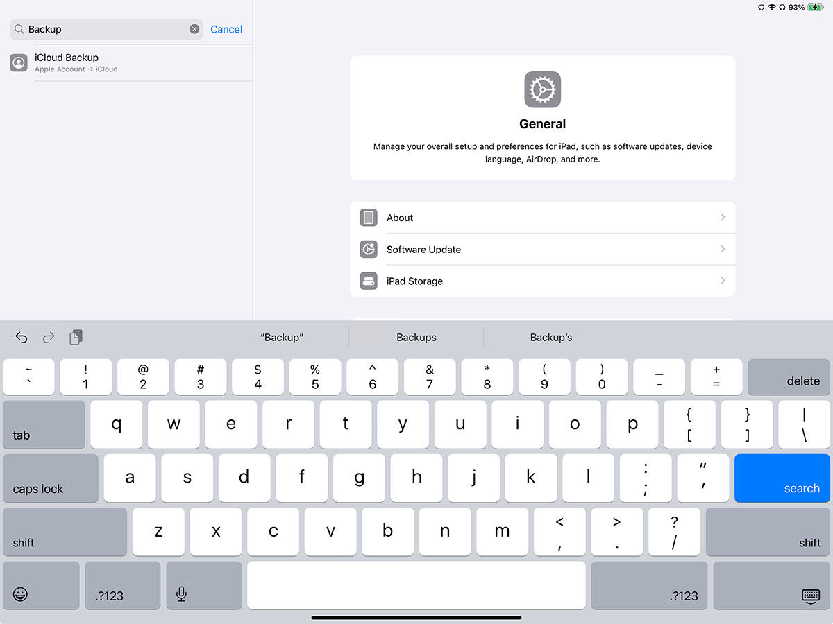 With one finger, pull down on the left-hand sidebar. This will reveal a search bar. Search for "Backup".