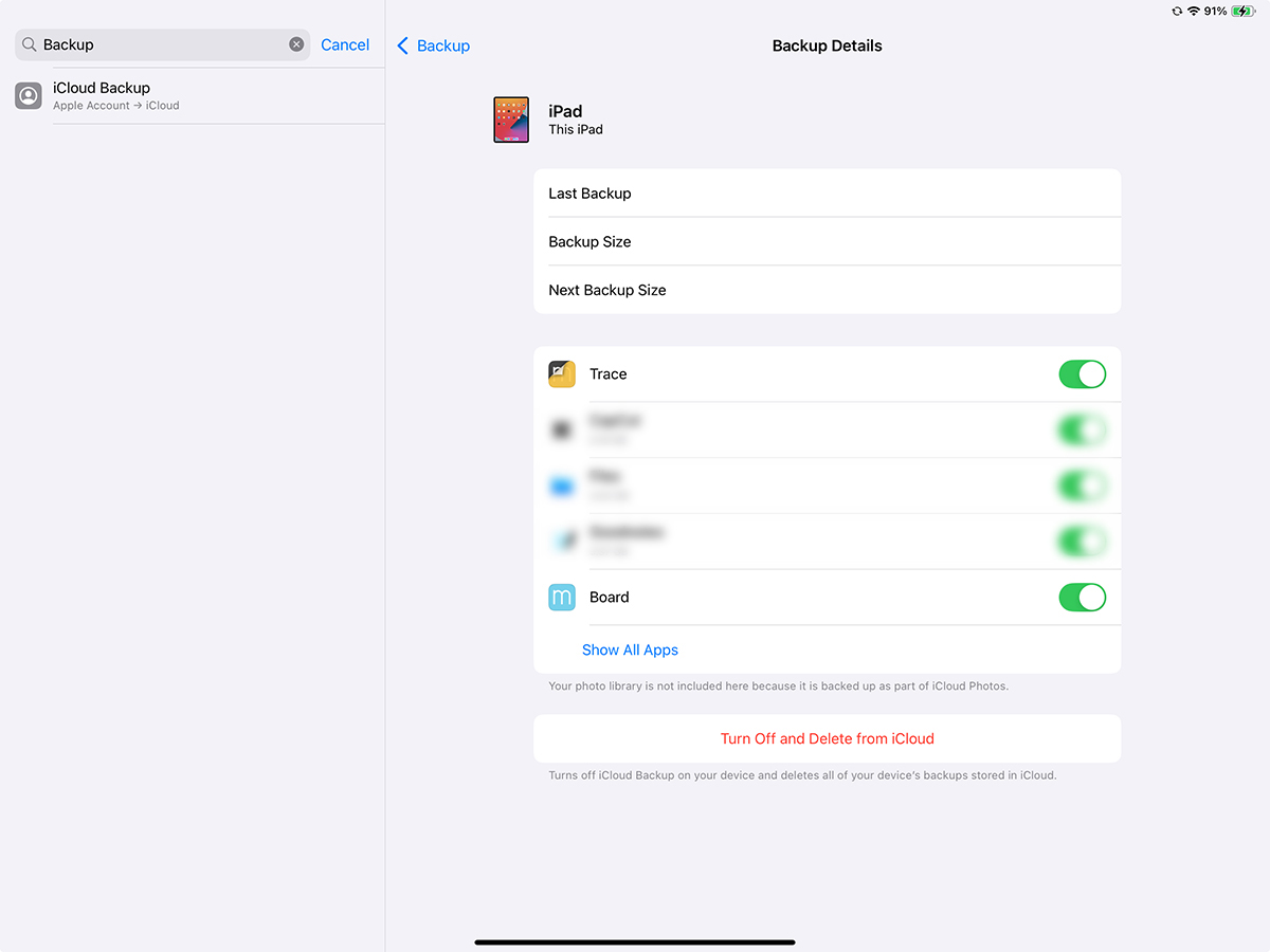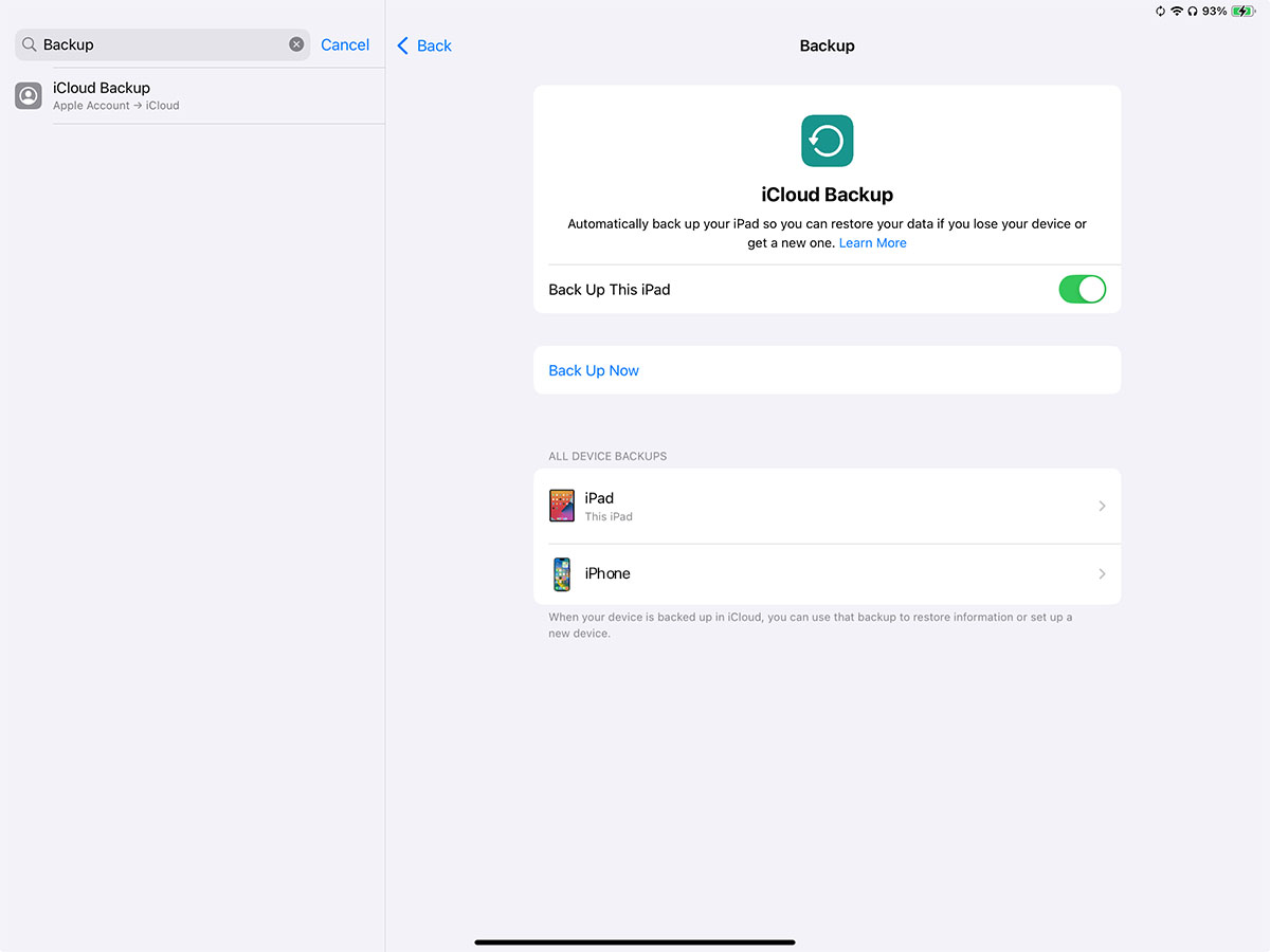 Turn on "Back Up This iPad" to save all of your data and apps, including Morpholio Board to your iCloud Backup. This will ensure that all of your Board projects are safe, even if you no longer have your device.