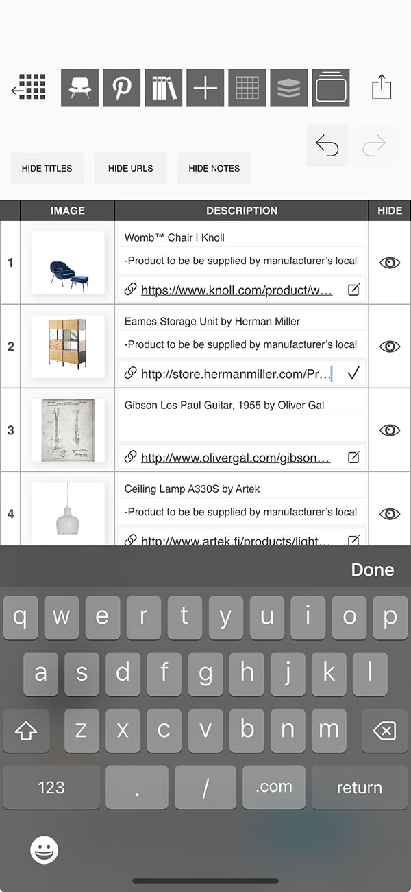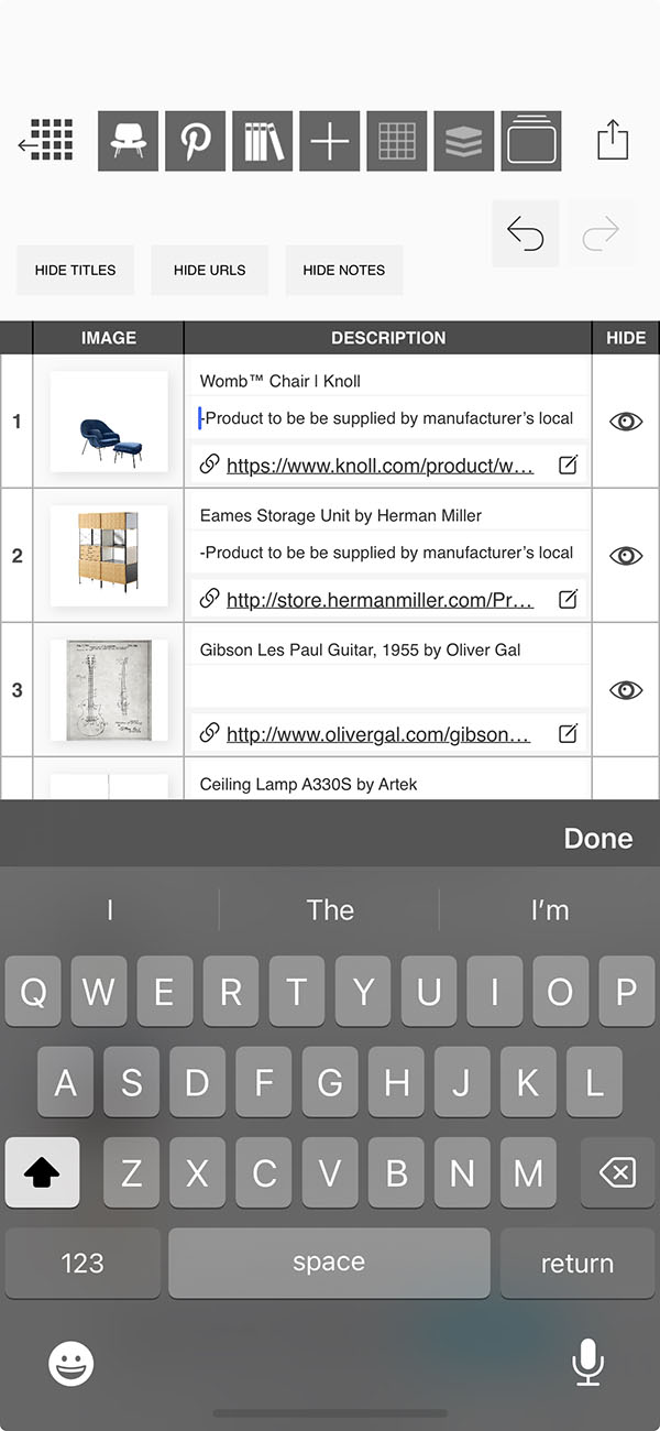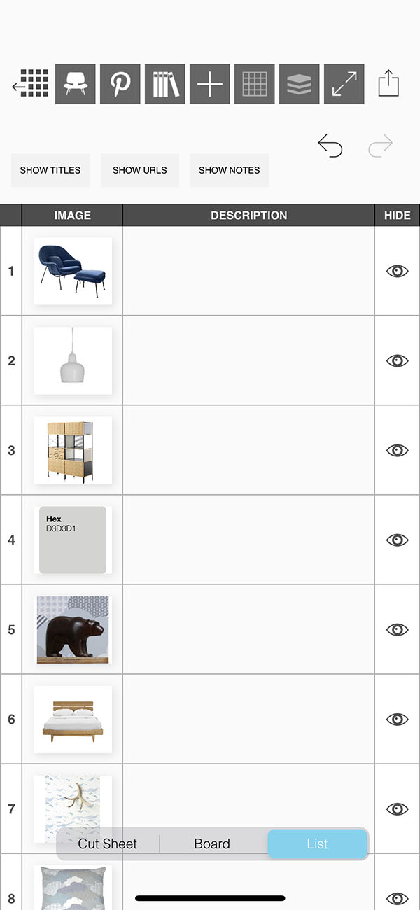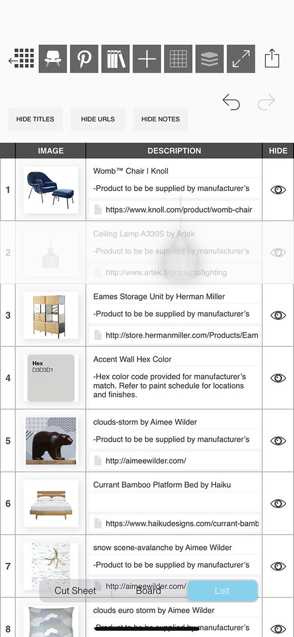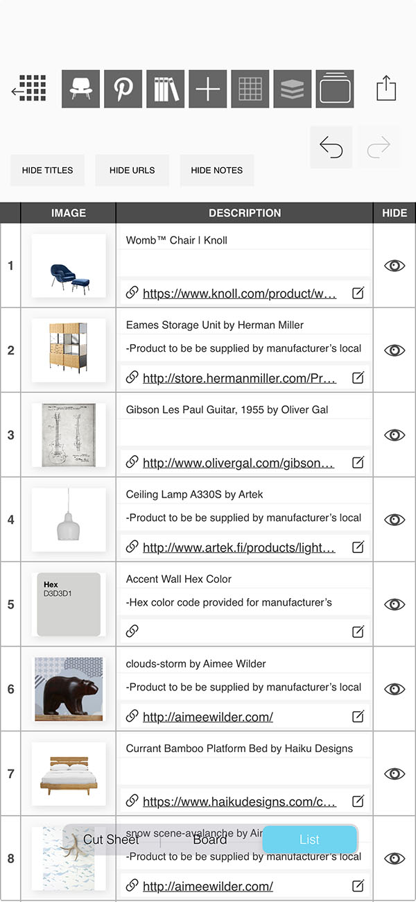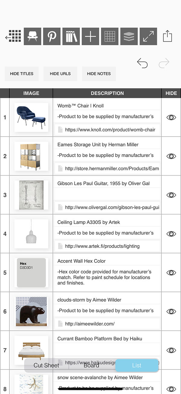 Creating a list of the products and furniture used in your interior design project can be a tedious task...but it is completely effortless with Morpholio Board! While you work on making the most beautiful moodboard, Morpholio Board is consolidating each item into a tidy list for you to share with your team, collaborators, or clients. This pro feature makes Morpholio Board the best app for interior design.