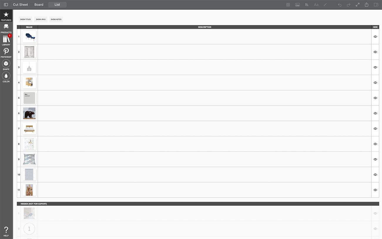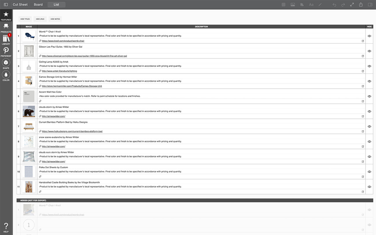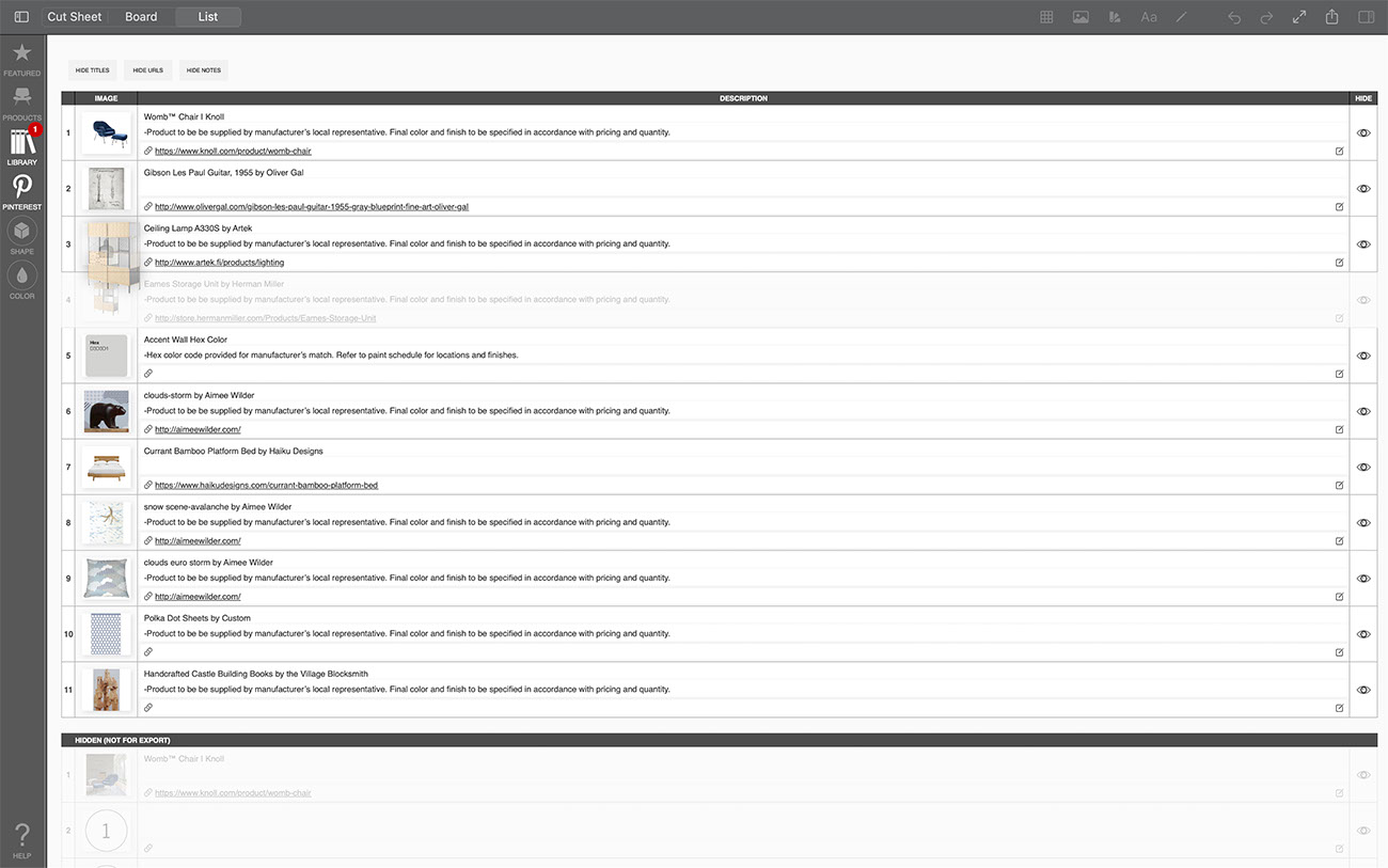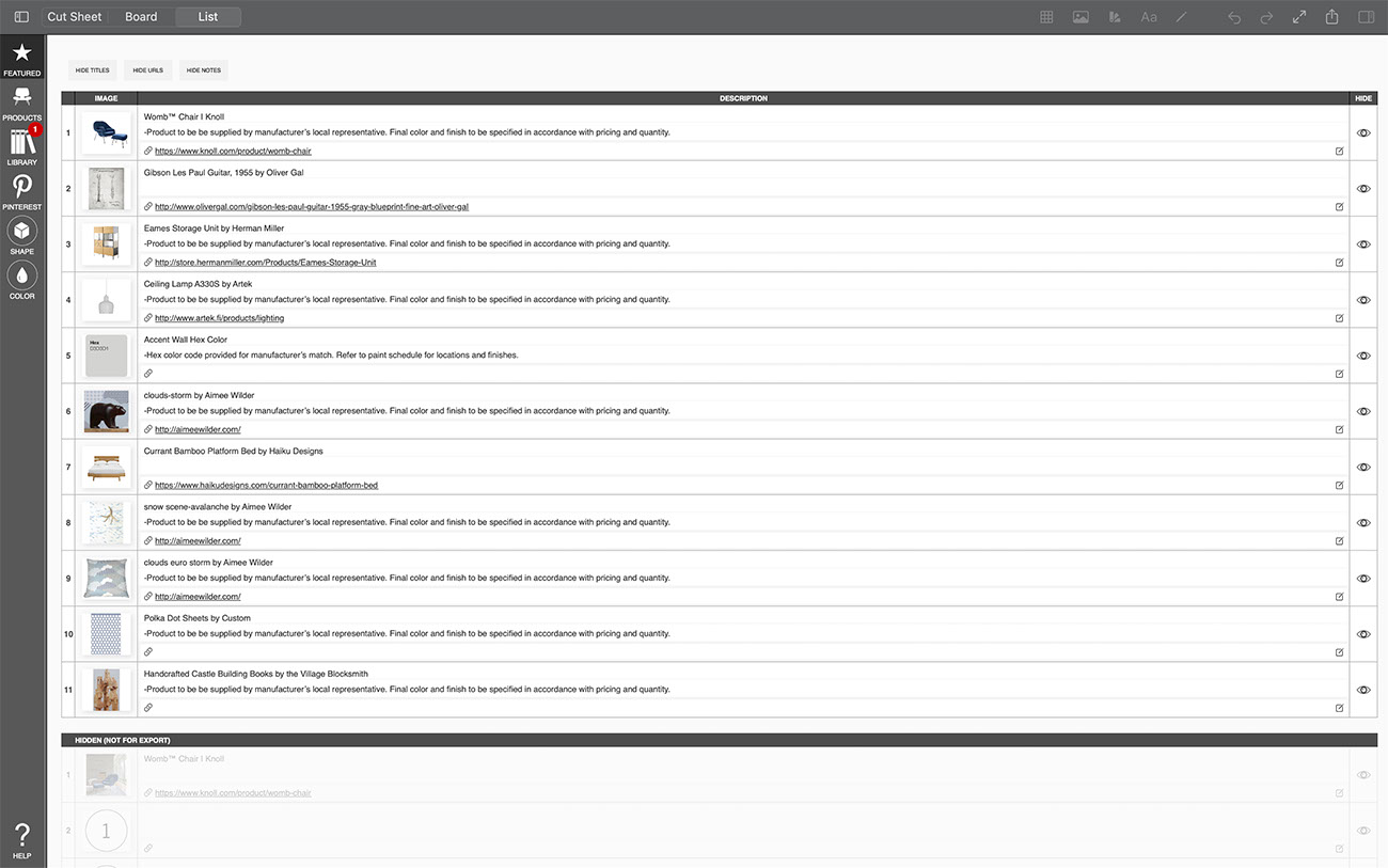 Creating a list of the products and furniture used in your interior design project can be a tedious task...but it is completely effortless with Morpholio Board! While you work on making the most beautiful moodboard, Morpholio Board is consolidating each item into a tidy list for you to share with your team, collaborators, or clients. This pro feature makes Morpholio Board the best app for interior design.