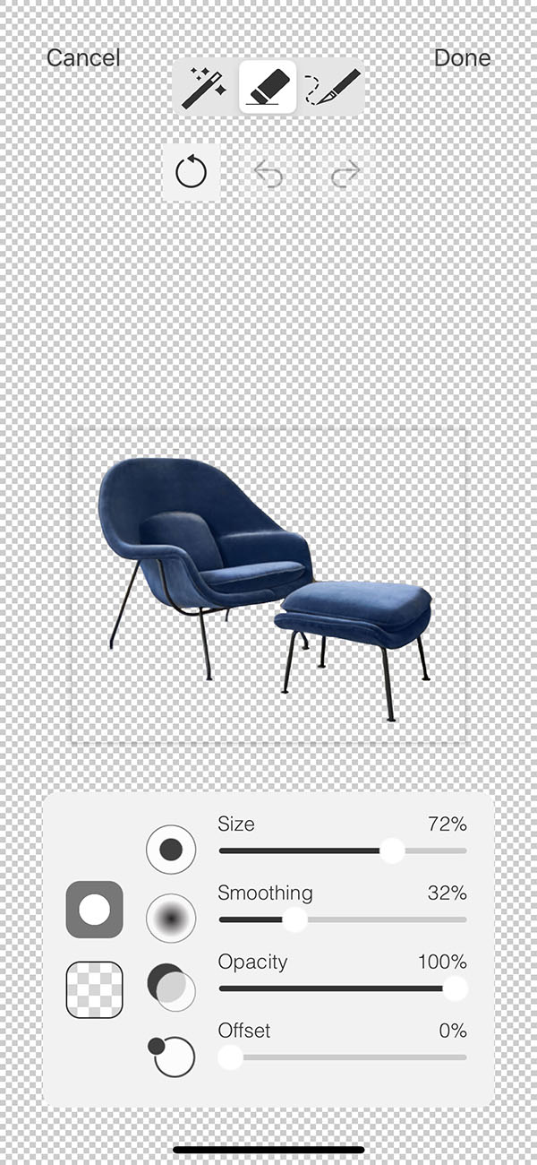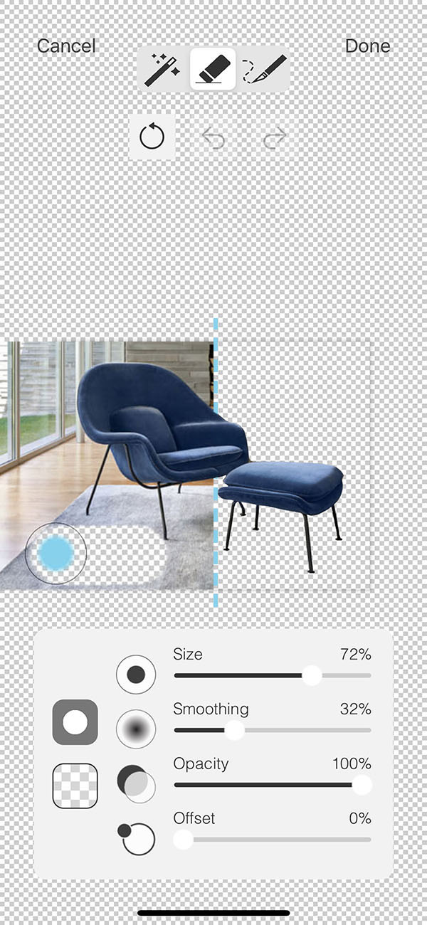 The new eraser will allow you to sweep away unwanted items in any photo and zoom in to perfect the details. Tap the Shape button to switch your brush between square and circle. Adjust your Size, Smoothing, and Opacity sliders to set your brush. If you're using your finger, adjust the Offset slider so you can see your brush as you move your finger over the screen.