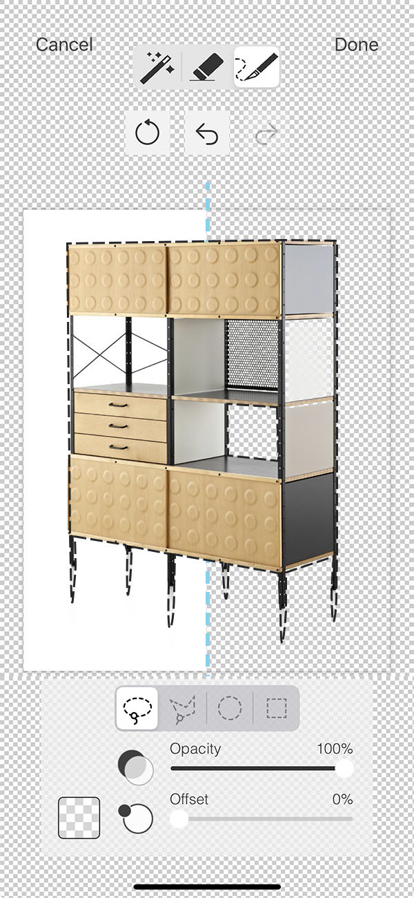 For bolder moves, use the magic knife to select large areas of an image to subtract. The knife works great for clipping unwanted shadows or use it to quickly pull an item out of a scene. You can pick between Freehand Lasso, Poly Lasso, Circle or Rectangle for how you'd like to cut out. You can also adjust the Opacity of your cut outs.